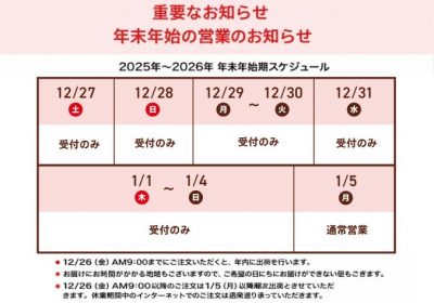 12/27(土)~1/4(日)迄、年末年始休暇を頂戴いたします