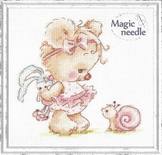 【Magicneedleマジックニードル社】apm17_16・リボンベビーベアーとかたつむり・子供向けクロスステッチキット・14CT・13×13・GAMMA糸使用