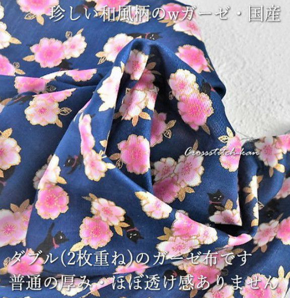 【SALE特価】手作りマスクに●反物Wガーゼ・和風柄・猫と桜・紺色●普通の厚み】幅110・1m・国産・ふんわりタイプ・gaze_sakura_konn_1m