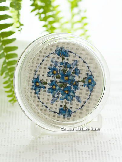 ■プレゼントに■ クロスステッチ刺繍完成品コースター5・円形・青いお花
