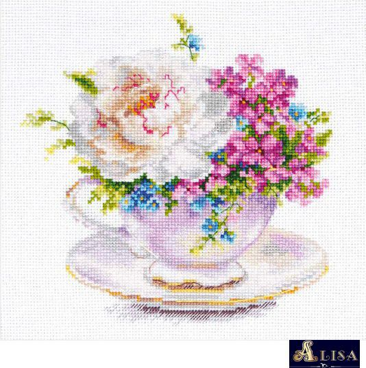 【Alisaアリサ社】2-57・A cup with Peony・ティーカップピオニー・クロスステッチキット・16CT・16×16・ロシア
