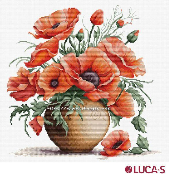 ●在庫限り・終了●【Luca-sルーカス社】B7022・Summer Rubies・赤ポピー茶色花瓶・クロスステッチキット・16CT・30×30・LUCA-S社糸