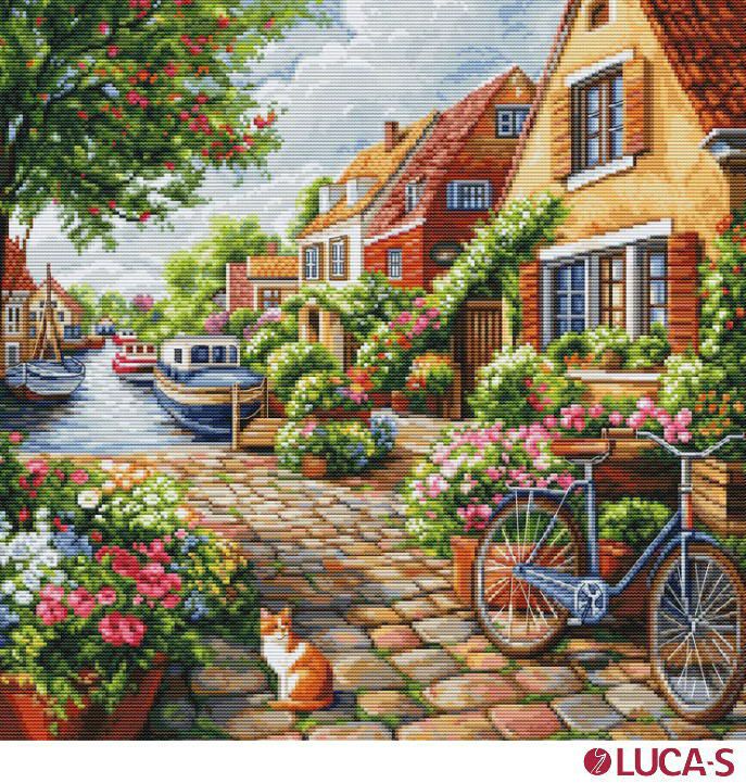 箱入り【Luca-sルーカス社】BU5078・Summerr splendor・運河の街並みと猫 クロスステッチキット・ライン入り16CT・LUCA-S社糸・全面刺し