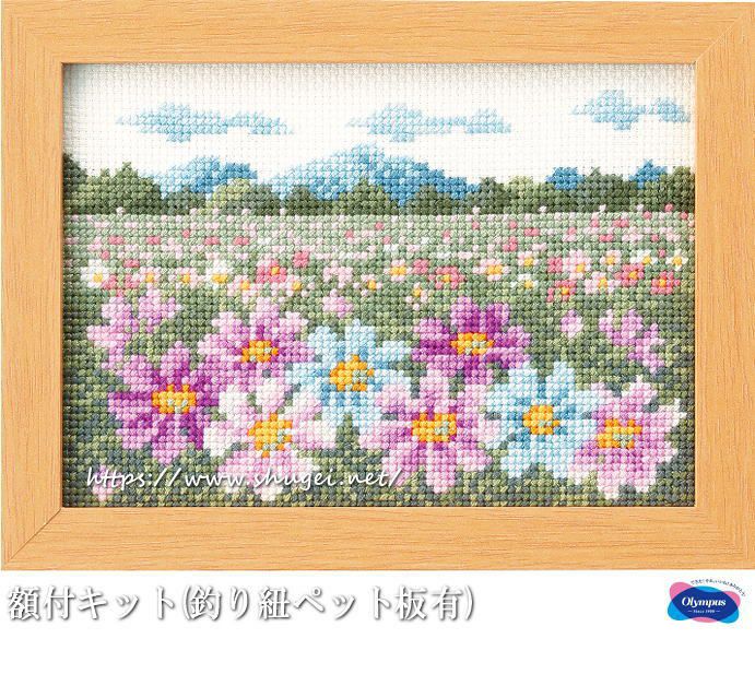 【オリムパス社】7554・10月コスモスの咲く風景・小さな花風景・クロスステッチキット・13ct・11.6×16.6・額付・初心者向簡単・olympus