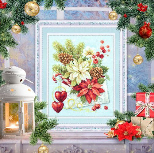 ポインセチアと松の実・刺繍キット・14CT・17×22
