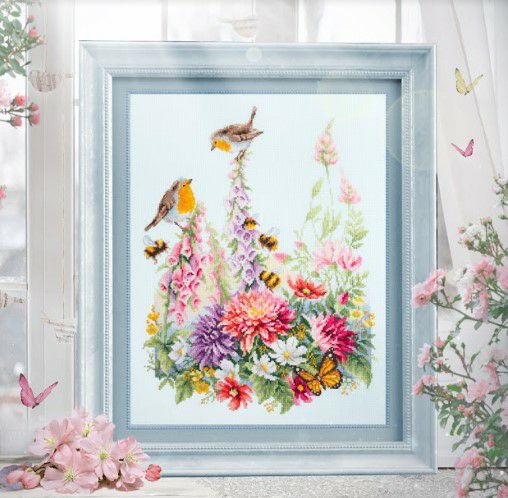 【Magicneedleマジックニードル社】apm130_032・コマドリと夏の花・Singing Robins・クロスステッチキット・14CT・31×40・GAMMA糸使用