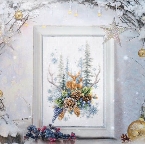 【Magicneedleマジックニードル社】apm200_017・Winter Forest Spirit・鹿と松の実・クロスステッチキット・14CT・17×27・旧パッケージ・GAMMA糸使用