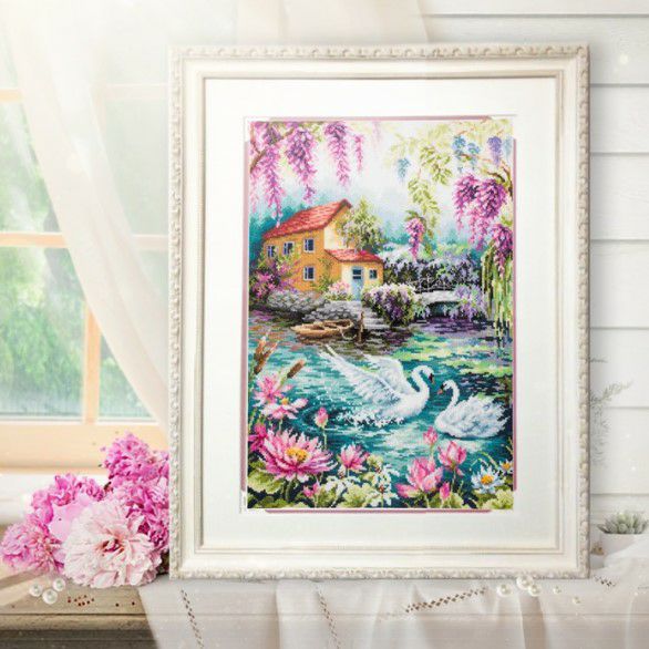白鳥・swan・スワン・湖畔・湖・睡蓮・水連・コテージ・cottage・藤・フジ・europe・ヨーロッパ風景・全面刺しキット