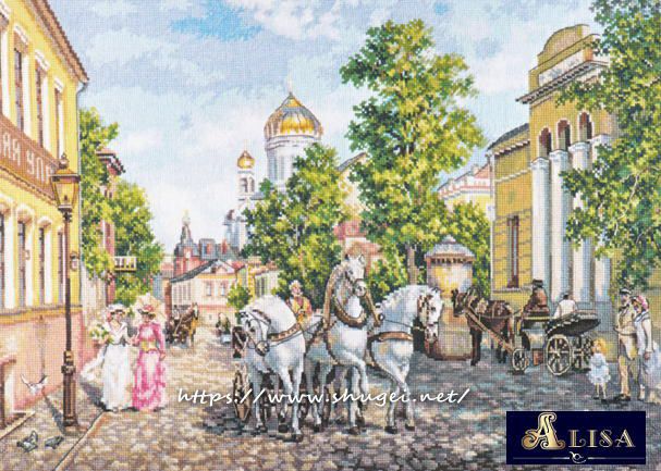 【Alisaアリサ社】3-31・Three horses・馬車と教会・クロスステッチキット・16CT・45×31・全面刺し・上級者向・ロシア