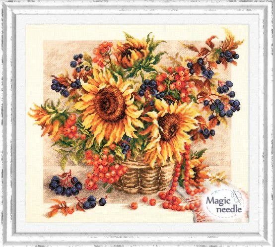 【Magicneedleマジックニードル社】apm40_76・ヒマワリとベリーバスケット・秋のアレンジ・クロスステッチキット・14CT・40×34・GAMMA糸使用