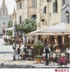 上半分の空や建物は、単色ベタ刺しが多く、簡単で早いけれど、やや退屈。それに対して下のお店や道は、ものすごく繊細で複雑な色使いです。次々にいろいろなポーズの人物が現れてくるのも楽しくて魅力的。