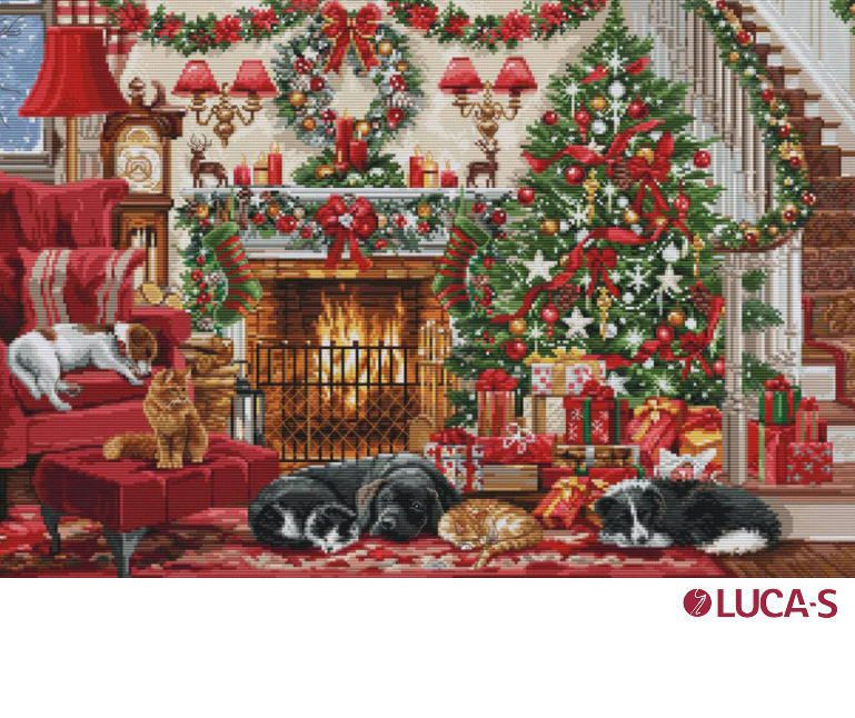 ●メーカー在庫切れ・再入荷未定●箱入り【Luca-sルーカス社】BU5041・Cosy Fireplace・暖炉の犬と猫・クロスステッチキット・ライン入16CT・49×33・LUCA-S社糸・全面刺し
