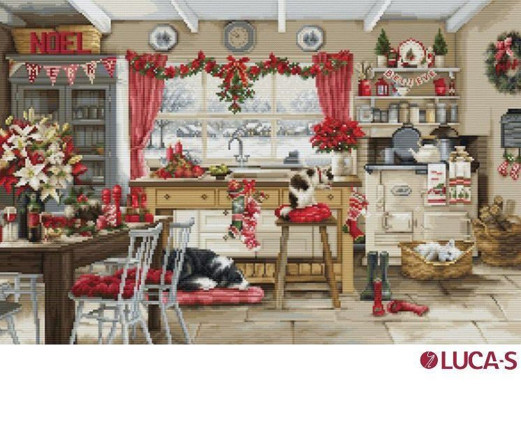 箱入り【Luca-sルーカス社】BU5053・Christmas Farmhouse・クリスマスの犬と猫・クロスステッチキット・ライン入16CT・47×32・LUCA-S社糸・全面刺