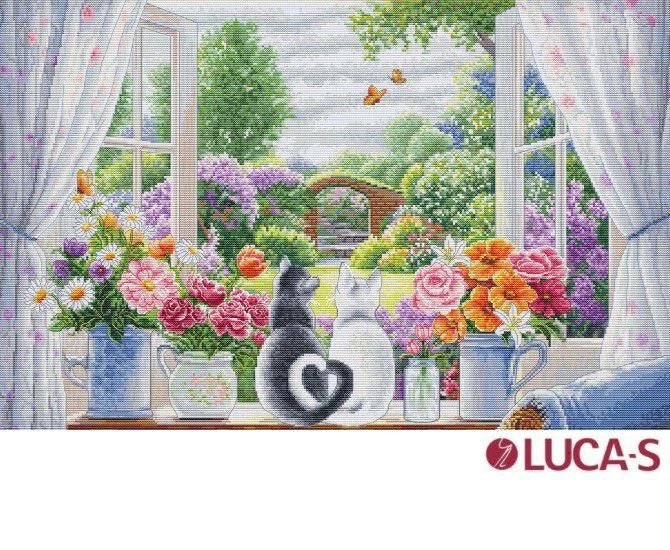 箱入り【Luca-sルーカス社】BU5088・The Window of Dreams・窓辺の猫2匹・クロスステッチキット・16CT・49×32・LUCA-S社糸・全面刺し