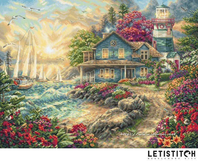 *海・yacht・ヨット・朝焼け・日の出・コテージ・cottage・庭園・gardening・ガーデニング・Europe・ヨーロッパ風景・灯台・全面刺し
