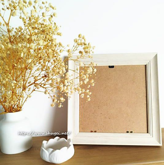 裏面1か所にフックがありますので、作品をはめ込んで壁にかけておけます。