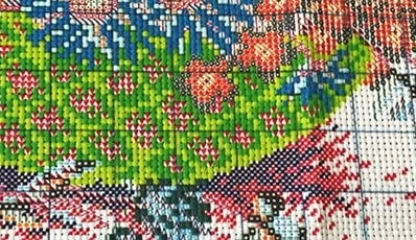 あらかじめ絵がフルカラーで印刷された、穴の開いたクロスステッチ用の刺しゅう布に刺す方法。目数をカウントする必要があります。印刷布の上から刺すので、立体的に仕上がりますが、刺繍する部分は非常に少なく、どちらかというと初心者向けの技法です。短時間で完成しますが中級・上級者には物足りないかもしれません。(中・上級者は大作の息抜きにお勧めです) クロスステッチ布に印刷。 その上から刺繍をします。 画像のような布地です。 クロスステッチ布に印刷。 その上から刺繍をします。