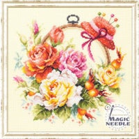 かわいいバラの色と向き、大きさが それぞれ違っていて 刺していて飽きないです。 AIDAの薄いブルーも すてきな色です。 -